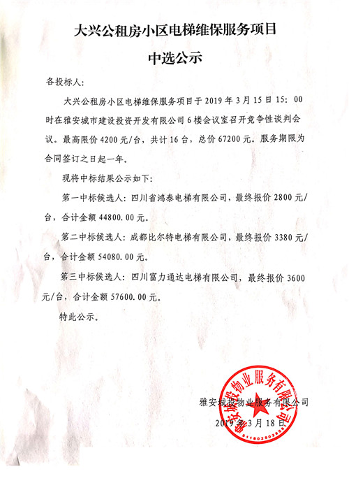 大興公租房小區電梯維護服務項目中選公示