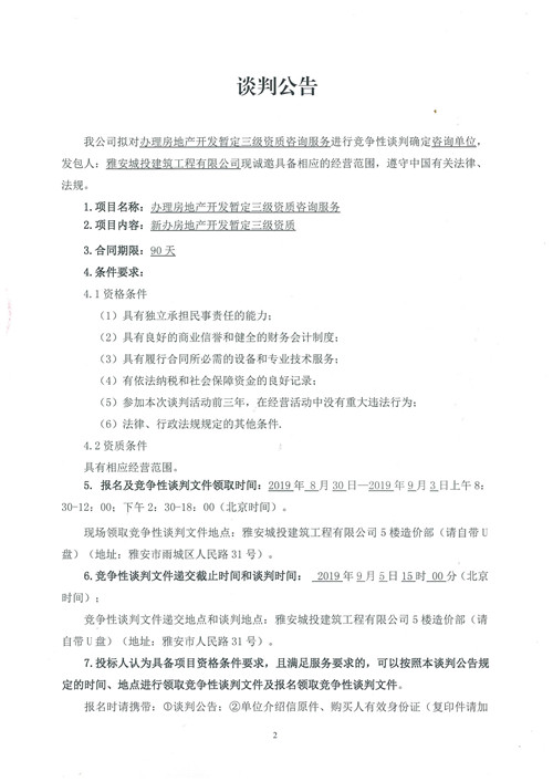 雅安城投建筑工程有限公司辦理房地產(chǎn)開發(fā)暫定三級(jí)資質(zhì)咨詢服務(wù)競爭性談判公告