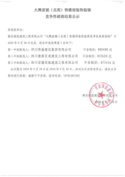 大興壹號(hào)(北苑)售樓部裝飾裝修競(jìng)爭(zhēng)性磋商結(jié)果公示