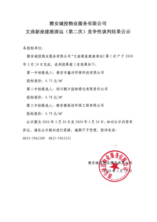 城投物業公司文曲新座建渣清運(第二次)競爭性談判結果公示