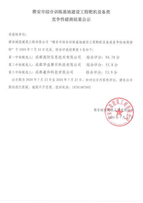 城投建工公司雅安市綜合訓練基地建設工程靶機設備類競爭性磋商結果公示