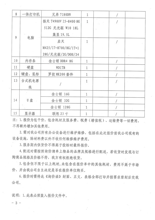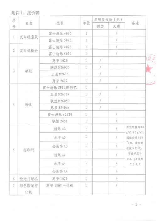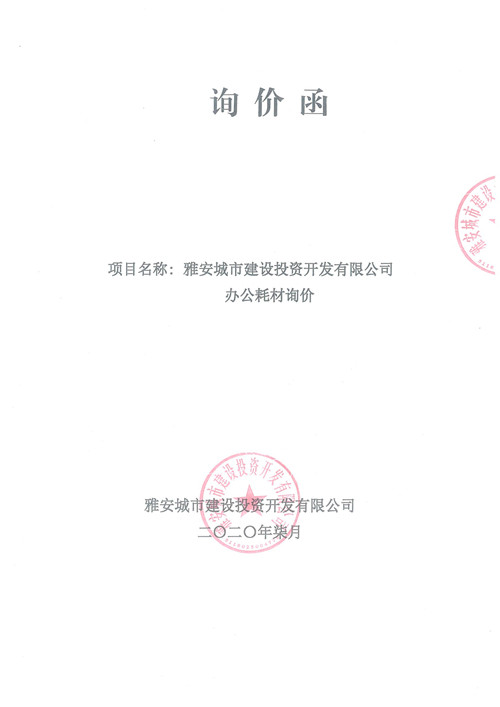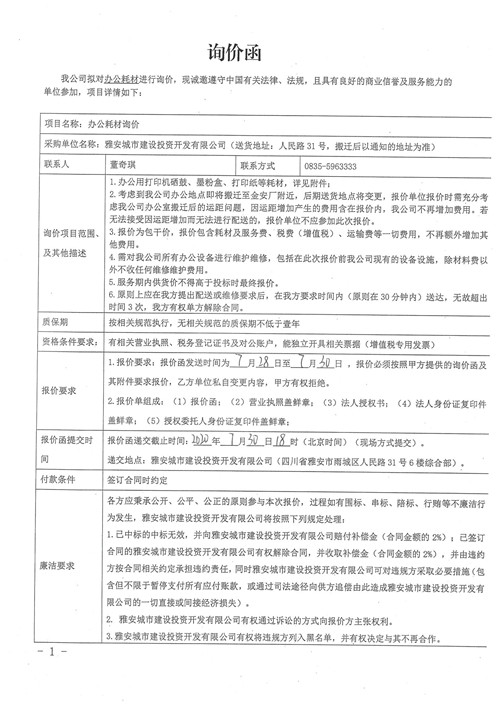 雅安城市建設投資開發有限公司辦公耗材詢價函