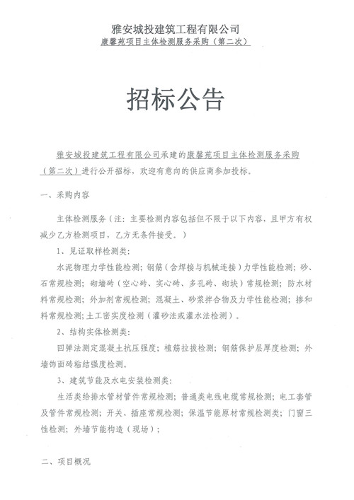 城投建工公司康馨苑項(xiàng)目主體檢測(cè)服務(wù)招標(biāo)公告(第二次)