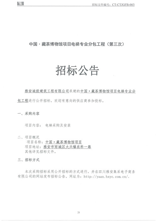 城投建工公司中國·藏茶博物館項目電梯專業分包工程招標公告(第三次)