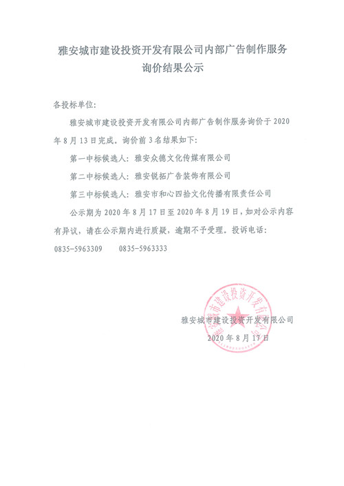 雅安城市建設投資開發有限公司公司內部廣告制作服務詢價結果公示