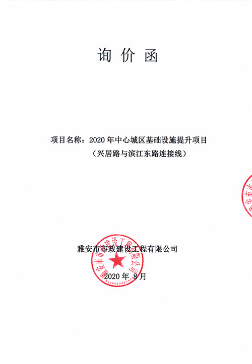 雅安市市政建設工程有限公司2020年中心城區基礎設施提升項目(興居路與濱江東路連接線)詢價函