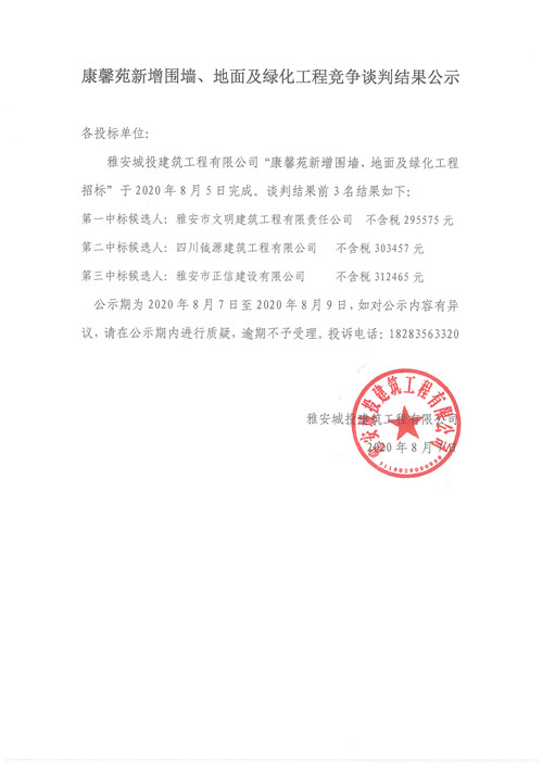 城投建工公司康馨苑新增圍墻、地面及綠化工程競爭性談判結果公示