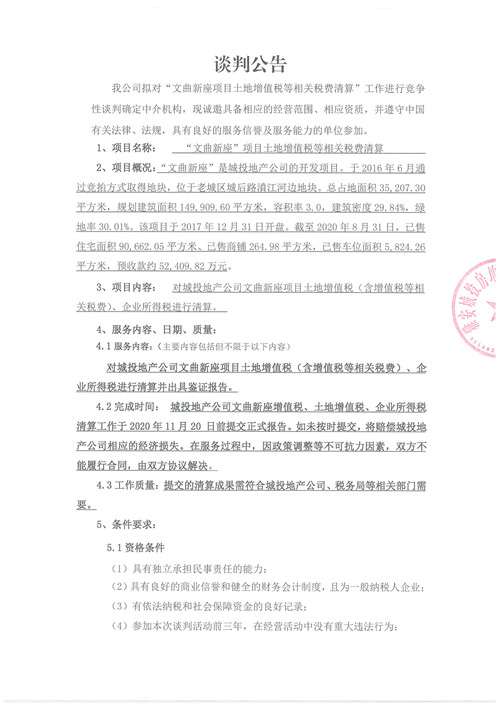 城投房地產公司“文曲新座項目土地增值稅等相關稅費清算”工作競爭性談判公告
