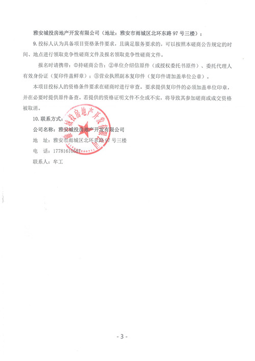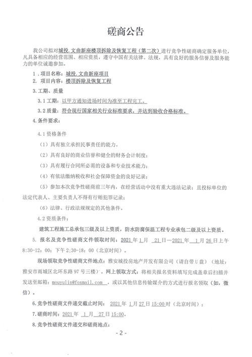 雅安城投房地產開發有限公司城投·文曲新座樓頂拆除及恢復工程(第二次)競爭性磋商公告