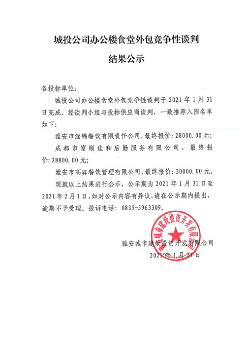 城投公司辦公樓食堂外包競爭性談判結果公示