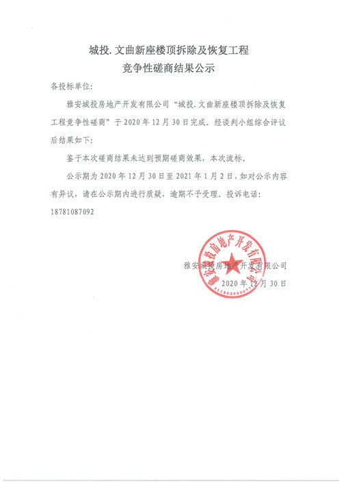 城投·文曲新座樓頂拆除及恢復工程競爭性磋商結果公示