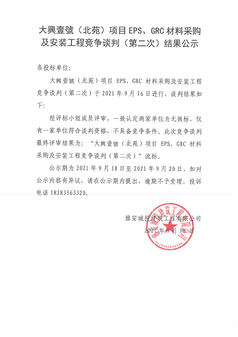 大興壹號(北苑)項(xiàng)目EPS、GRC材料采購及安裝工程競爭談判(第二次)結(jié)果公示