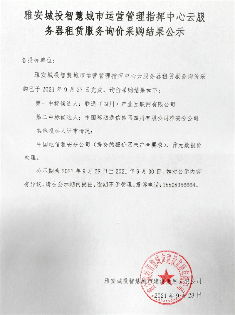 雅安城投智慧城市運營管理指揮中心云服務器租賃服務采購詢價結(jié)果公示