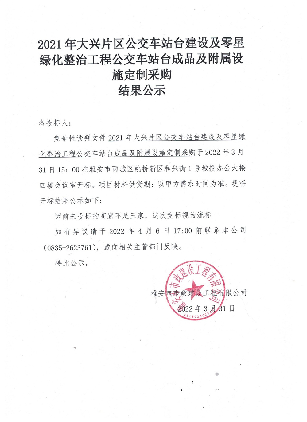 2021年大興片區公交站臺建設及零星綠地整治工程公交站臺成品及附屬設施定制采購結果公示