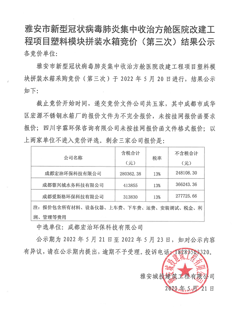 雅安市新型冠狀病毒肺炎集中收治方艙醫院改建工程項目塑料模塊拼裝水箱競價(第三次)結果公示