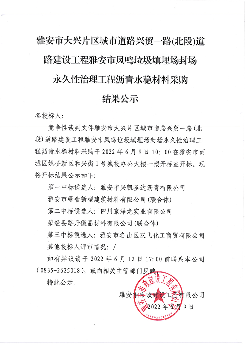 雅安市大興片區城市道路興貿一路(北段)道路建設工程雅安市鳳鳴垃圾填埋場封場永久性治理工程瀝青水穩材料采購結果公示