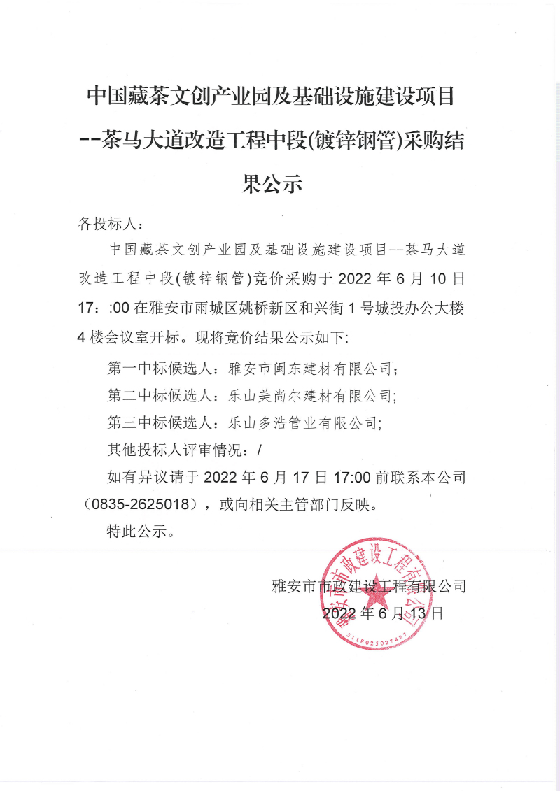 中國(guó)藏茶文創(chuàng)產(chǎn)業(yè)園及基礎(chǔ)設(shè)施建設(shè)項(xiàng) 茶馬大道改造工程中段鍍鋅鋼管采購(gòu)結(jié)果公示