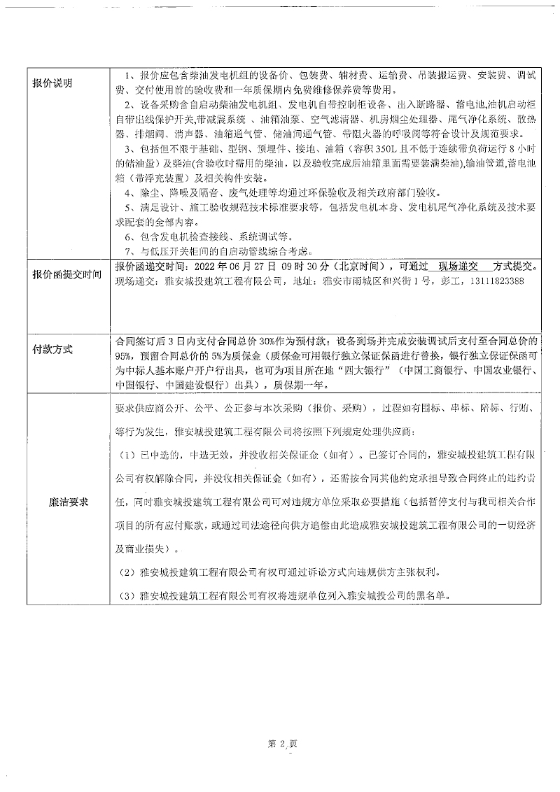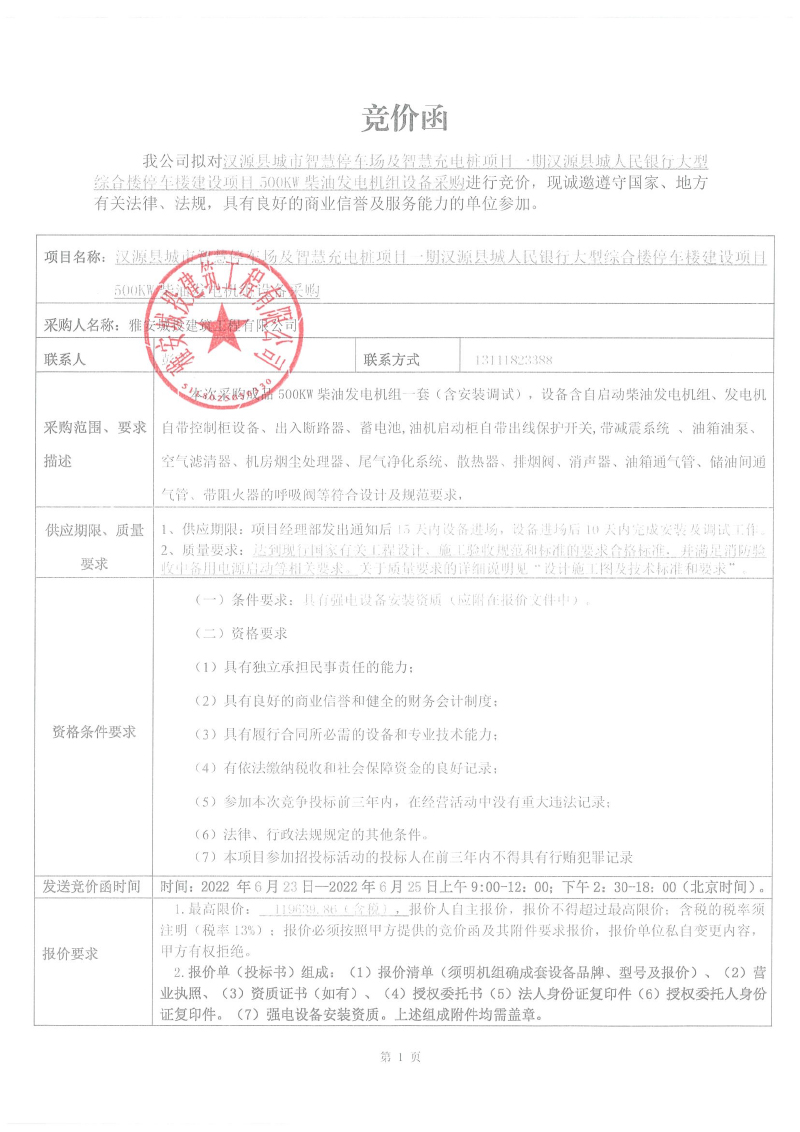 漢源縣城市智慧停車場及智慧充電樁項目一期漢源縣城人民銀行大型綜合樓停車樓建設項目500kw柴油發電機組設備采購競價公告
