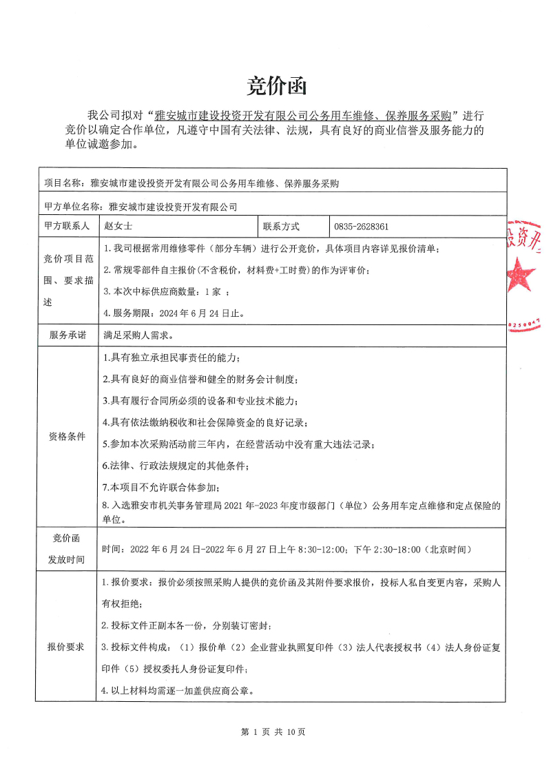雅安城市建設投資開發有限公司 公務用車維修、保養服務采購項目競價公告
