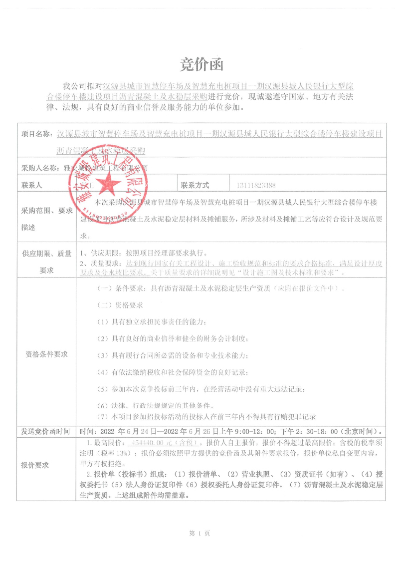 漢源縣城市智慧停車場及智慧充電樁項目一期漢源縣城人民銀行大型綜合樓停車樓建設(shè)項目瀝青混凝土、水穩(wěn)層采購競價公告