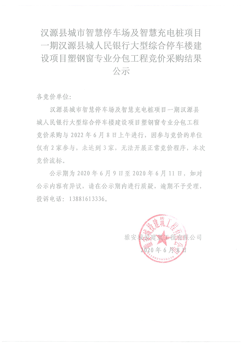 漢源縣城市智慧停車場及智慧充電樁項(xiàng)目一期漢源縣城人民銀行大型綜合樓停車樓建設(shè)項(xiàng)目塑鋼窗專業(yè)分包工程競價(jià)采購結(jié)果公示