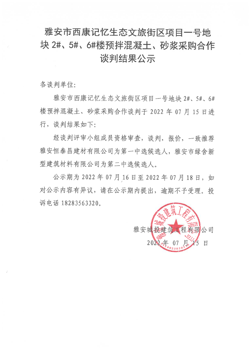 雅安市西康記憶生態文旅街區項目一號地塊2#、5#、6#樓預拌混凝土、砂漿采購合作談判結果公示