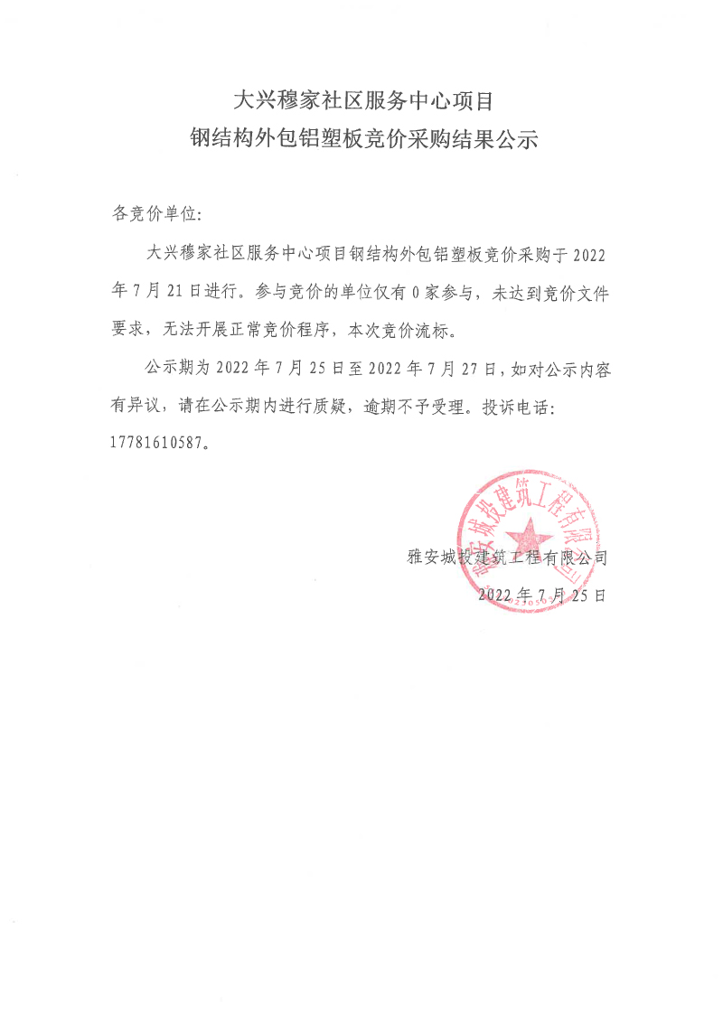 大興穆家社區服務中心項目鋼結構外包鋁塑板競價采購結果公示