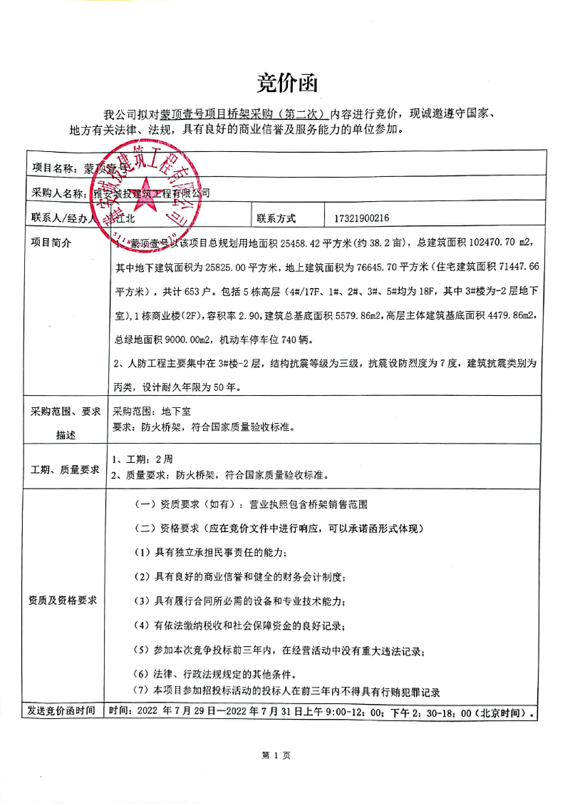 蒙頂壹號項目橋架采購(第二次)競價公告