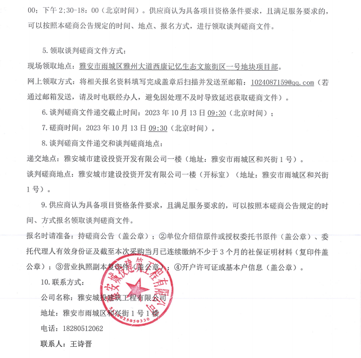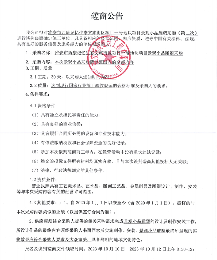 雅安市西康記憶生態文旅街區項目一號地塊項目景觀小品雕塑采購(第二次)談判磋商公告