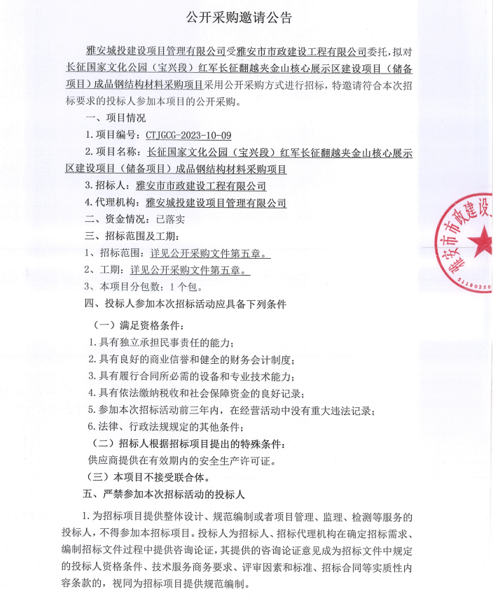 長征國家文化公園(寶興段)紅軍長征翻越夾金山核心展示區建設項目(儲備項目)成品鋼結構材料采購項目公開采購邀請公告