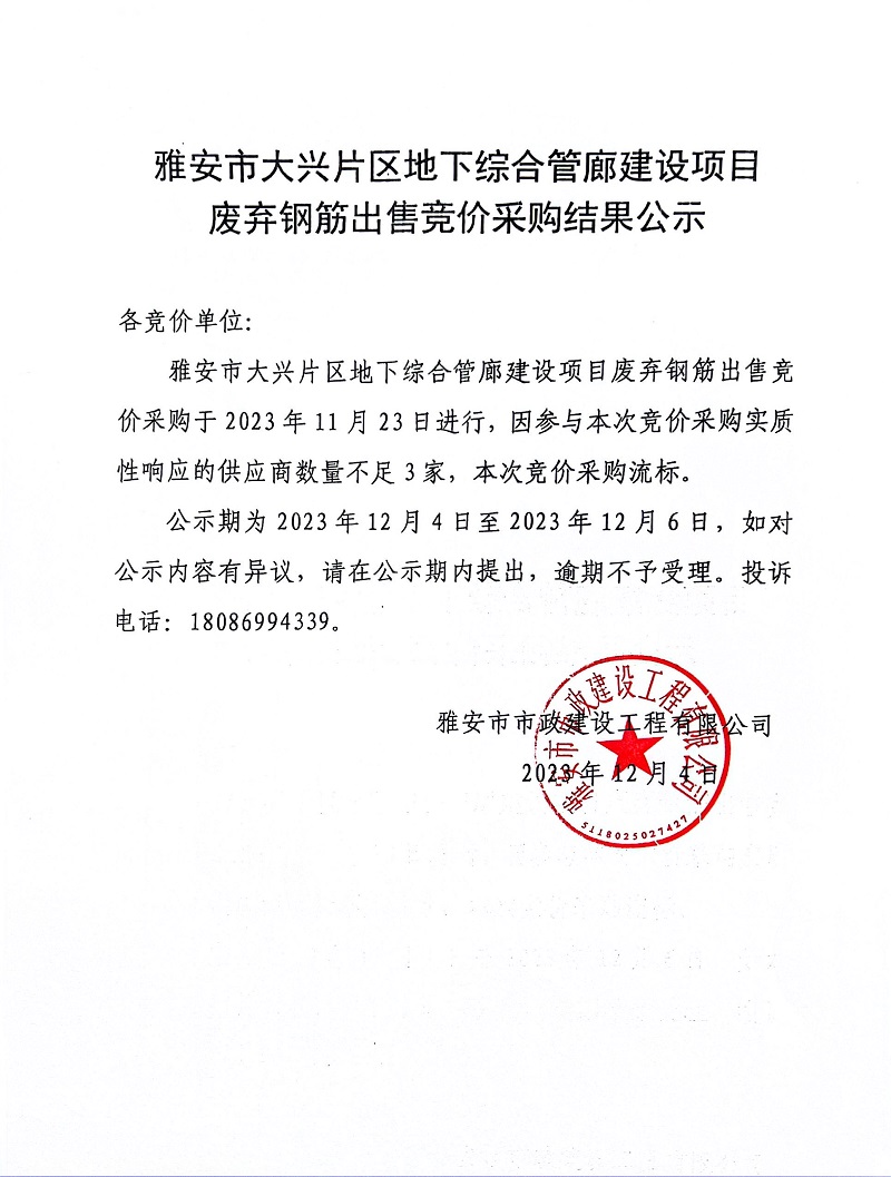 雅安市大興片區地下綜合管廊建設項目廢棄鋼筋出售競價采購結果公示