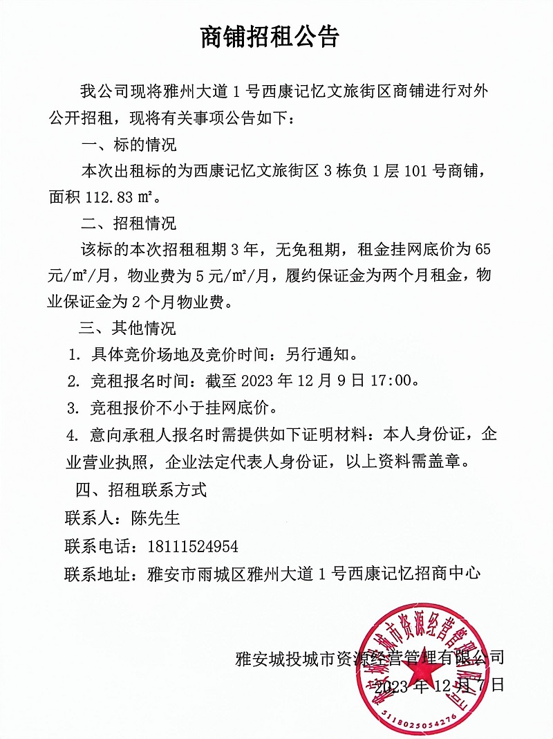 雅州大道1號西康記憶文旅街區3棟負1層101號商鋪招租公告