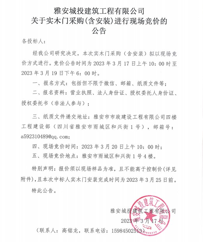 雅安城投建筑工程有限公司關于實木門采購(含安裝)進行現場競價的公告