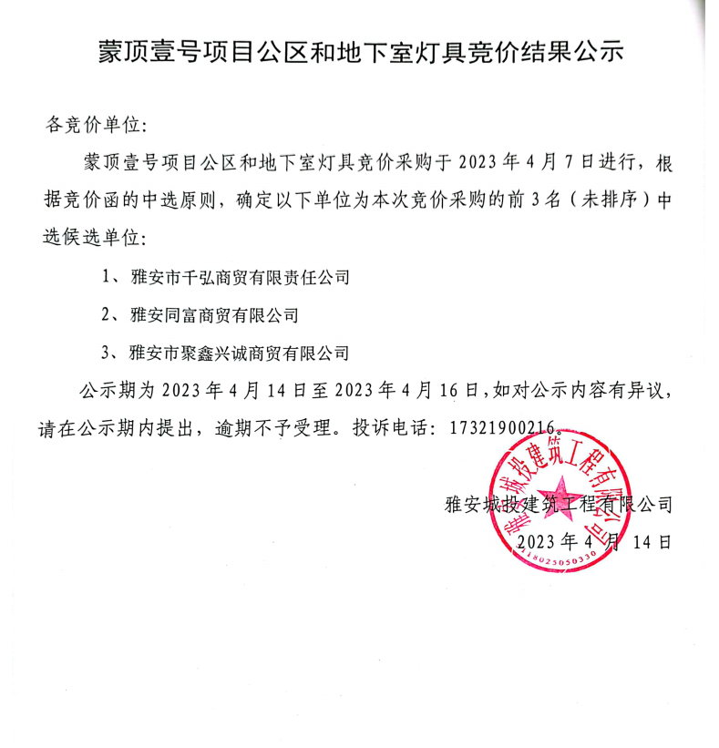 蒙頂壹號項目公區和地下室燈具競價結果公示
