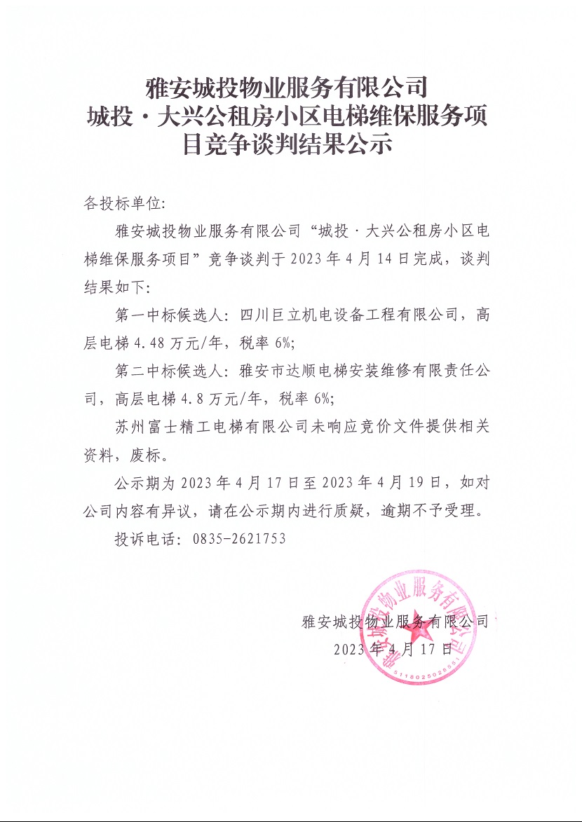 雅安城投物業有限公司城投·大興公租房小區電梯維保服務項目競爭談判結果公示