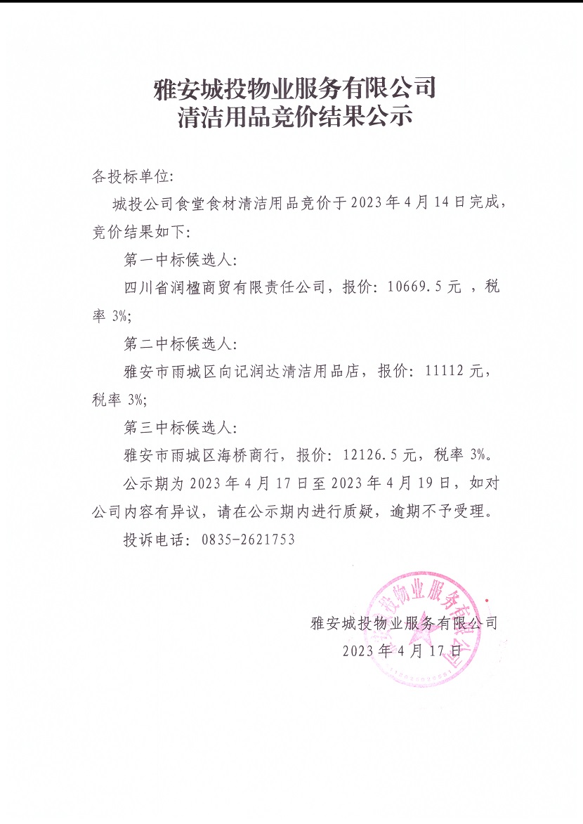 雅安城投物業服務有限公司清潔用品競價結果公示