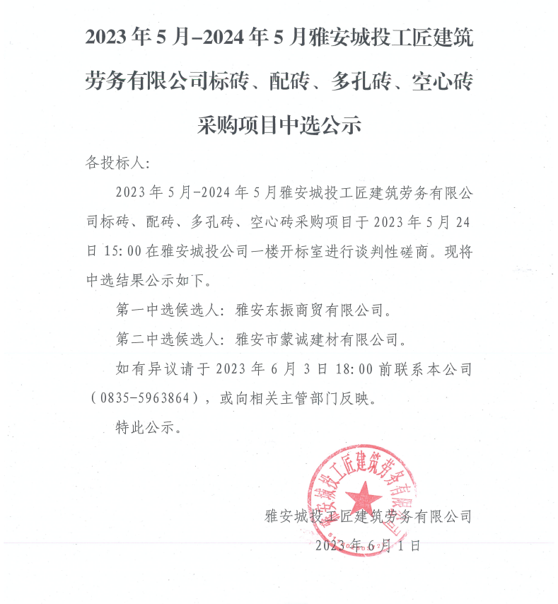 2023年5月-2024年5月雅安城投工匠建筑勞務有限公司標磚、配磚、多孔磚、空心磚采購項目中選公示