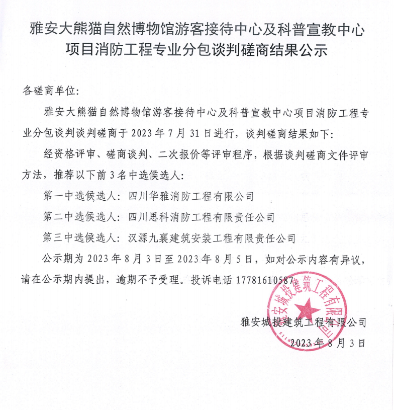 雅安大熊貓自然博物館游客接待中心及科普宣教中心項目消防工程專業分包談判磋商結果公示