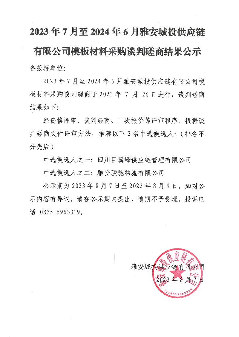 2023年7月至2024年6月雅安城投供應鏈有限公司模板材料采購談判磋商結果公示