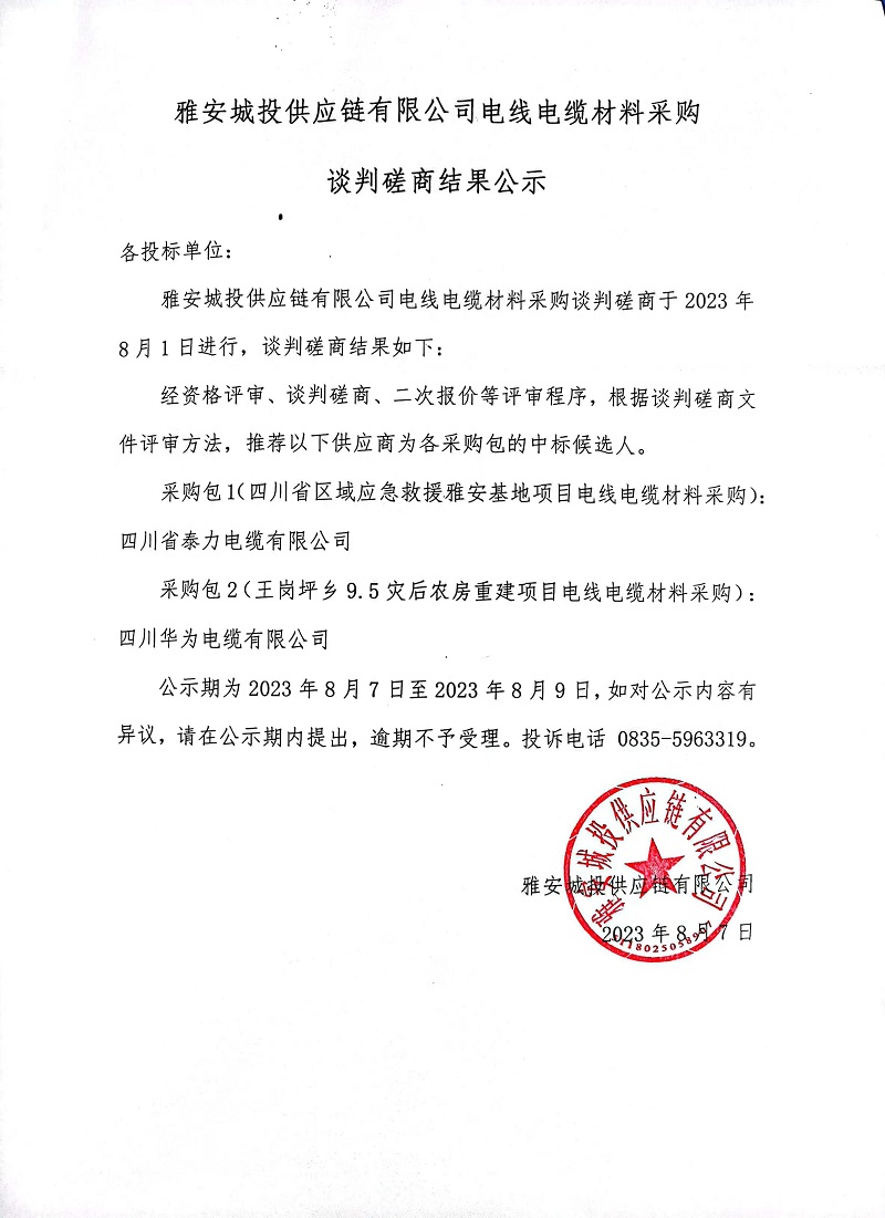雅安城投供應鏈有限公司電線電纜材料采購談判磋商結果公示