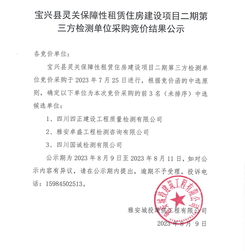 寶興縣靈關保障性租賃住房建設項目二期第三方檢測單位采購競價結果公示