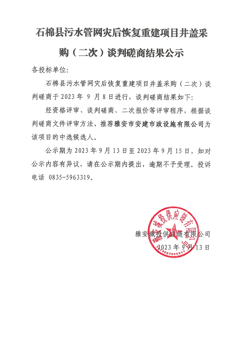 石棉縣污水管網災后恢復重建項目井蓋采購(二次)談判磋商結果公示
