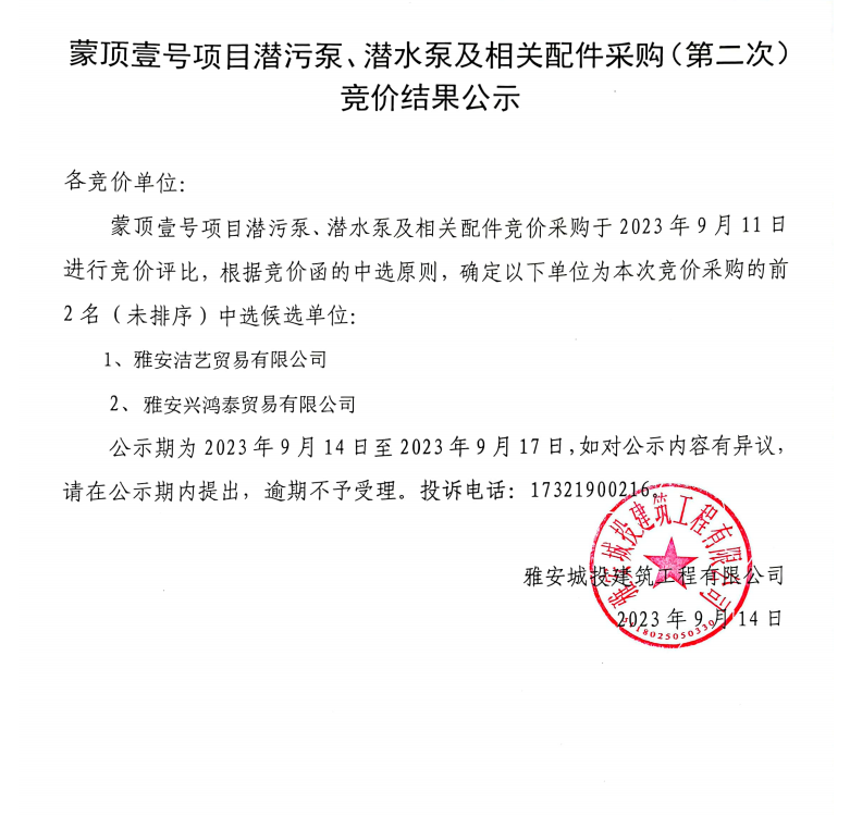 蒙頂壹號項目潛污泵、潛水泵及相關配件采購(第二次)競價結果公示