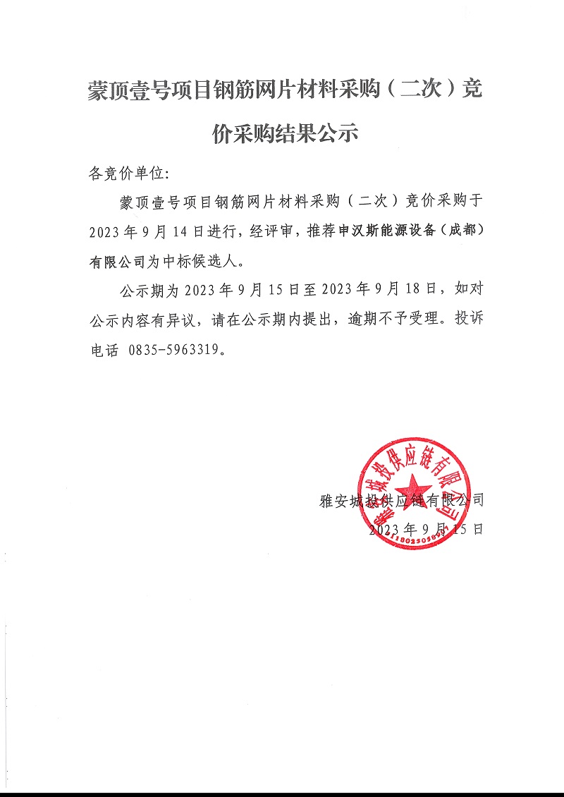 蒙頂壹號項目鋼筋網片材料采購(二次)競價采購結果公示