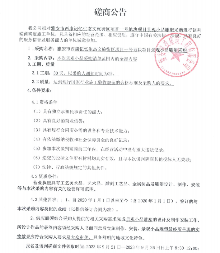 雅安市西康記憶生態文旅街區項目一號地塊項目景觀小品雕塑采購談判磋商公告