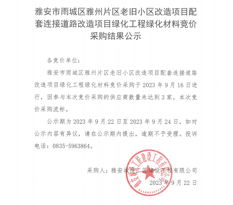 雅安市雨城區雅州片區老舊小區改造項目配套連接道路改造項目綠化工程綠化材料競價采購結果公示