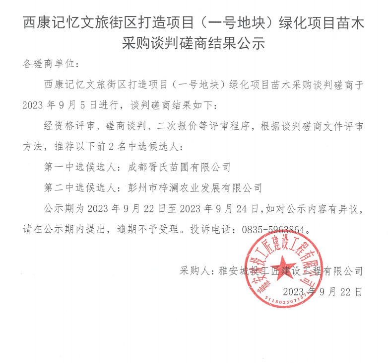 西康記憶文旅街區打造項目(一號地塊)綠化項目苗木采購談判磋商結果公示