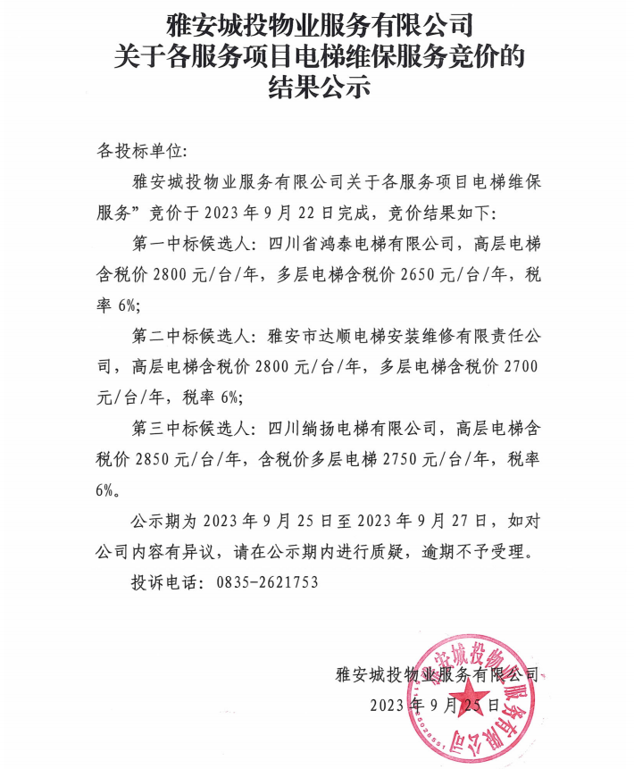 雅安城投物業服務有限公司關于各服務項目電梯維保服務競價的結果公示