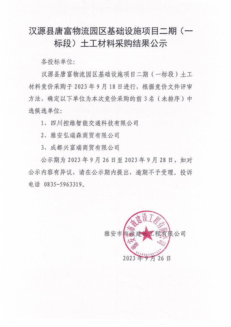 漢源縣唐富物流園區基礎設施項目二期(一標段)土工材料采購結果公示