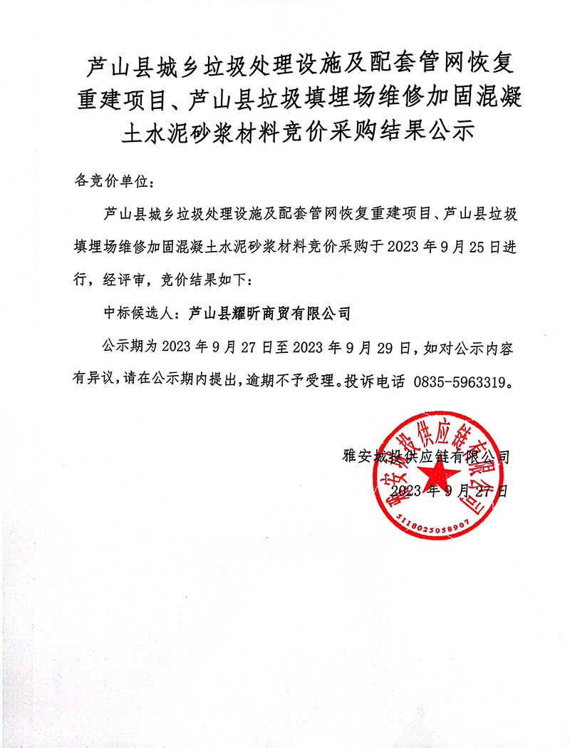 蘆山縣城鄉垃圾處理設施及配套管網恢復重建項目、蘆山縣垃圾填埋場維修加固混凝土水泥砂漿材料競價采購結果公示